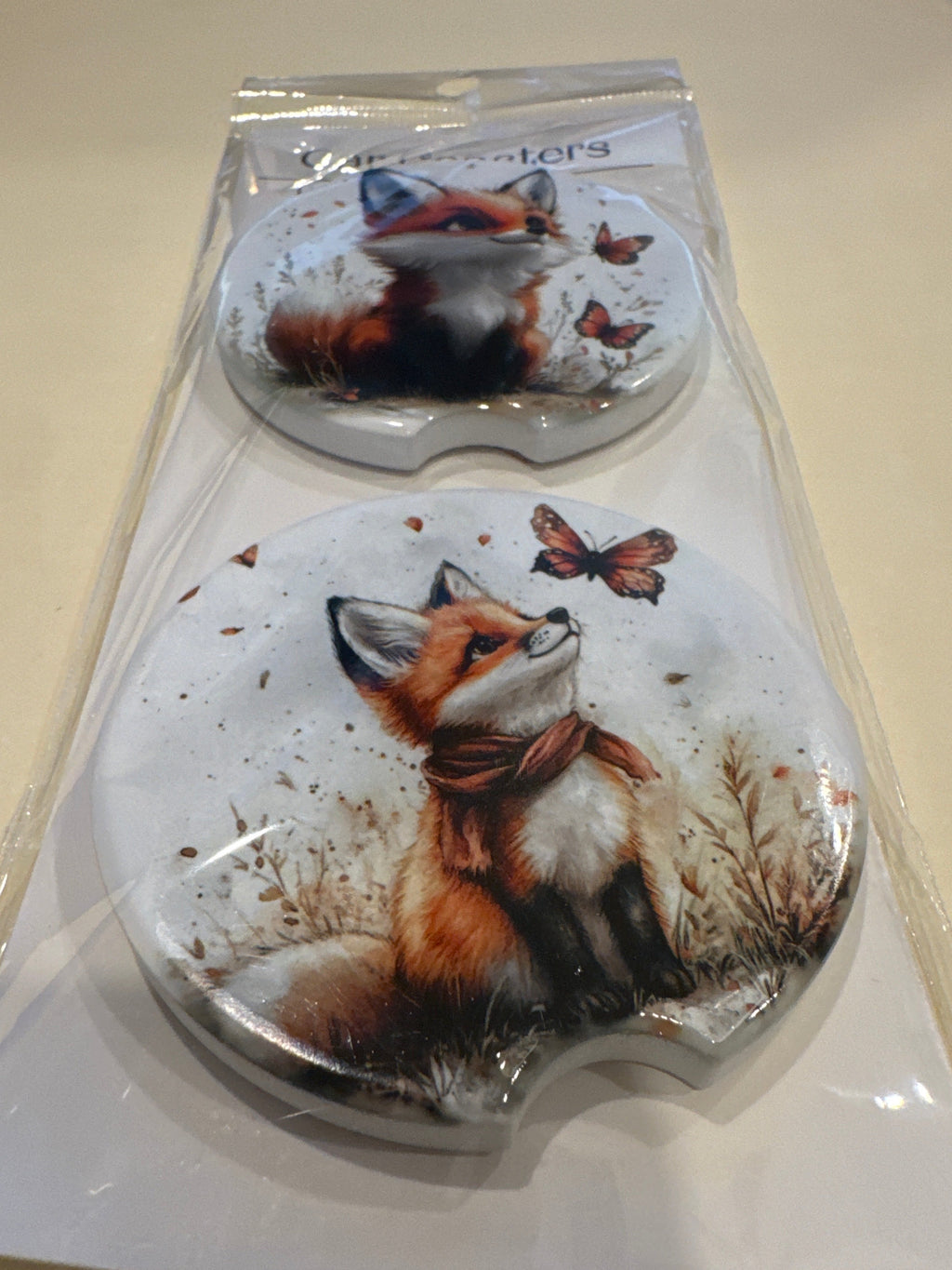 Car Coaster Ceramic- Custom Made Fox & Butterfly 2 PK (designs may vary)