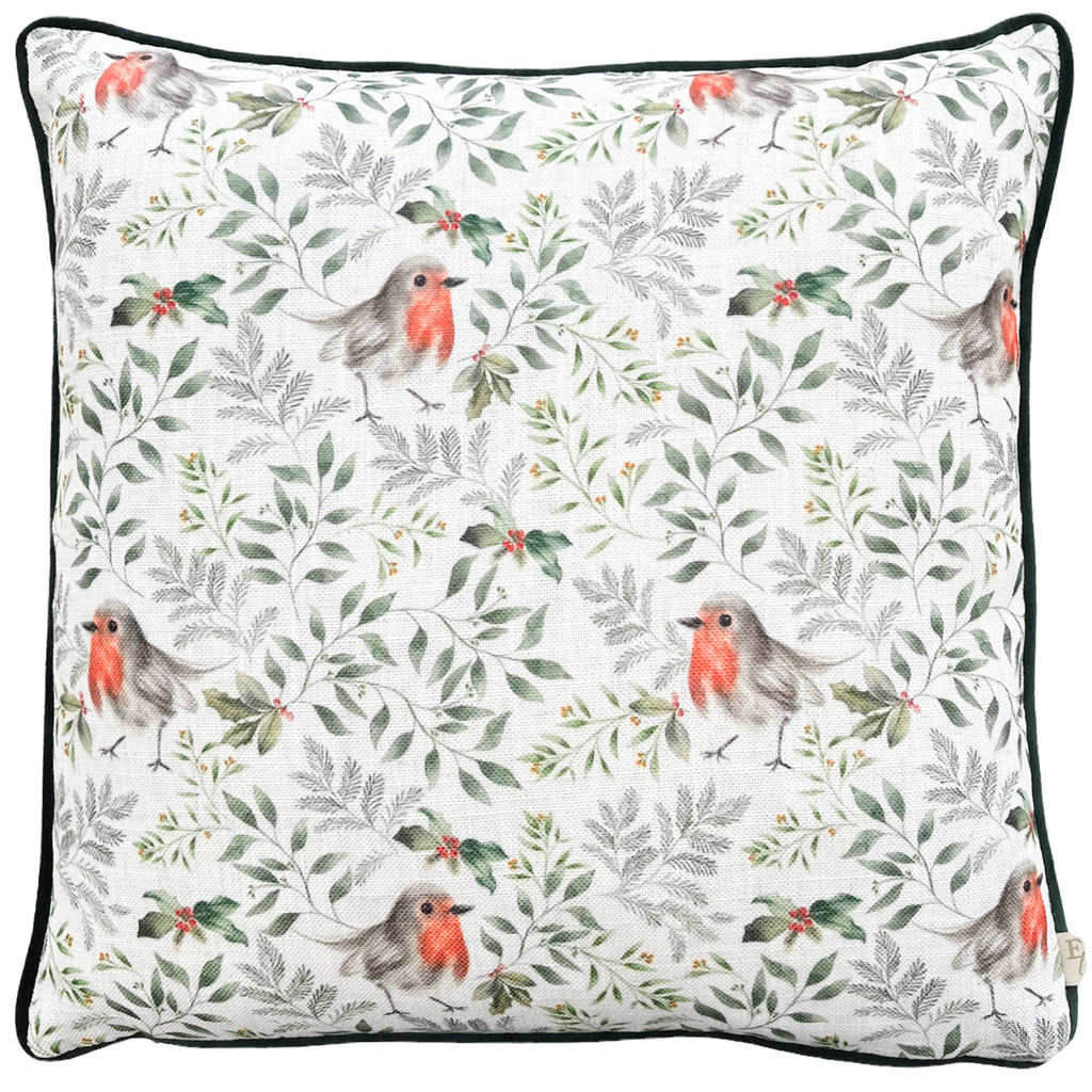 A wonderfully festive cushion, featuring friendly winter robins who perch among the fresh, green winter florals, including holly. Lovingly hand painted and printed on a soft poly linen face, with an exquisitely soft reverse, piped trim and zip fastening. A wonderful seasonally designed cushion which will help put some festive cheer into your soft furnishings. Featuring a hand drawn and printed painterly design of winter robins posing among the winter foliage. Complete with an exquisitely soft plain velvet reverse, piped trim and zip fastening.
