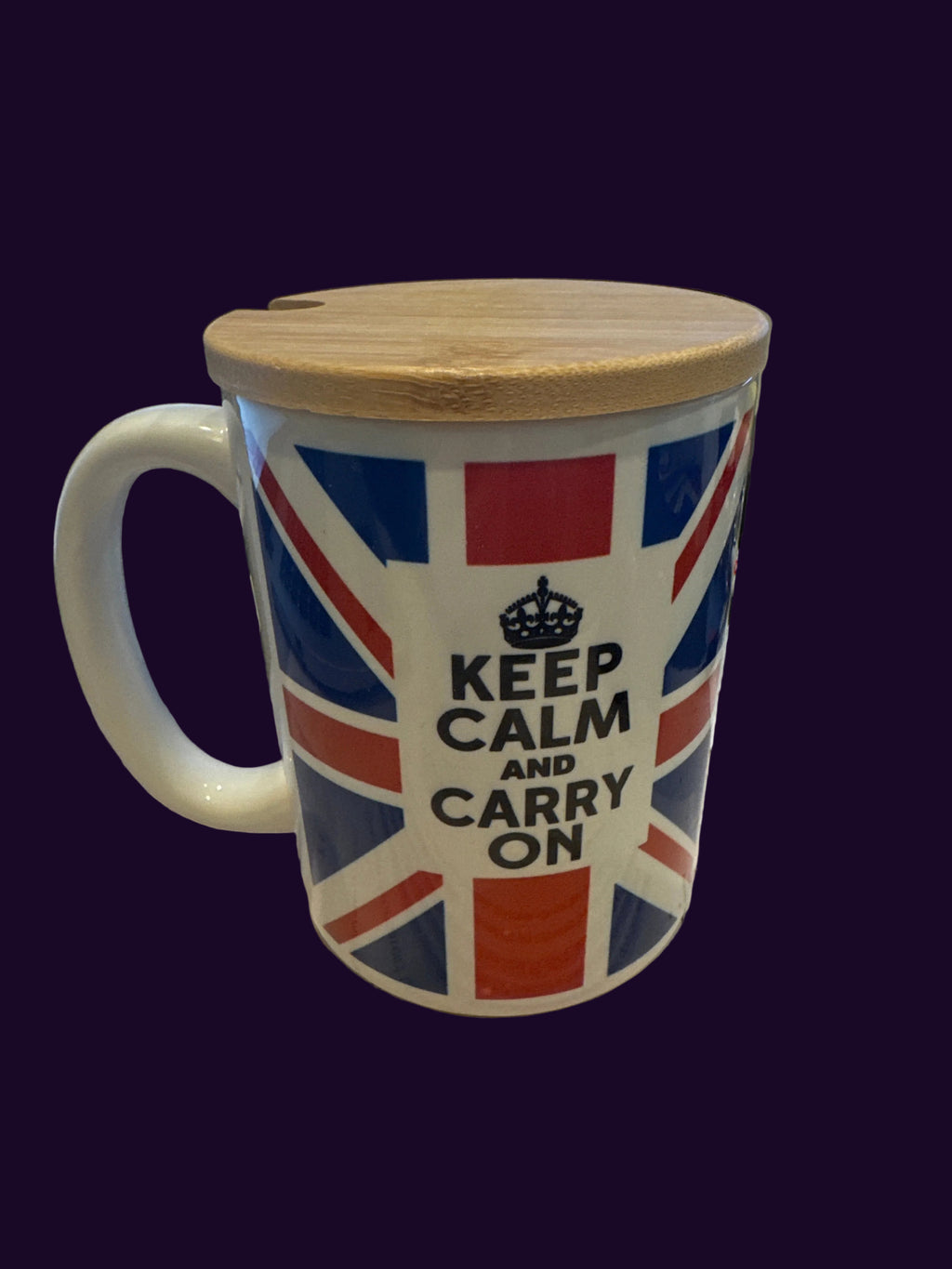 Mug 15oz. Union Jack Flag Keep Calm and Carry On with wood lid/coaster.