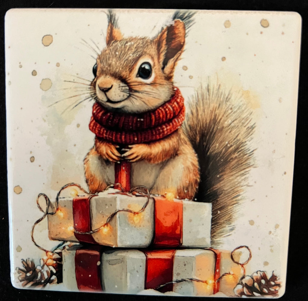 This artisan-crafted square coaster showcases a delightful squirrel wearing a cozy scarf, surrounded by festive presents in a carefully composed holiday scene. Each piece is custom-made with precision, blending seasonal charm with everyday utility. The design captures the warmth of gift-giving through intricate detailing and vibrant imagery. Built to withstand regular use, this coaster protects your surfaces while serving as a conversation-starting accent piece that celebrates the joy of the holiday season.