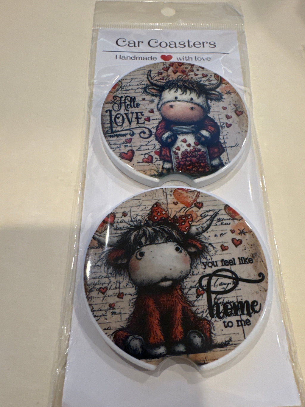 Car Coaster Ceramic. Custom Made Highland Cow "Hello Love" Set of 2
