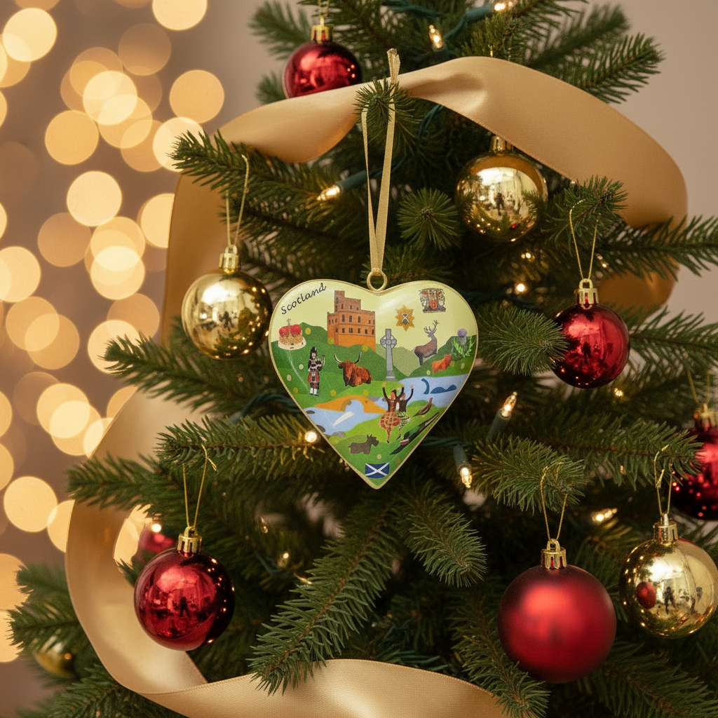 The Tinker Tailor Highland Scotland Heart Christmas Metal Ornament beautifully captures the essence of the Scottish Highlands in a heart-shaped design. Crafted with precision, this ornament highlights the rugged landscape and cultural richness of the region, making it a distinguished addition to your holiday décor. Perfect for those who wish to celebrate Scotland’s natural beauty and heritage with elegance during the festive season. Approximately 4x4 in / 10x10 cm.