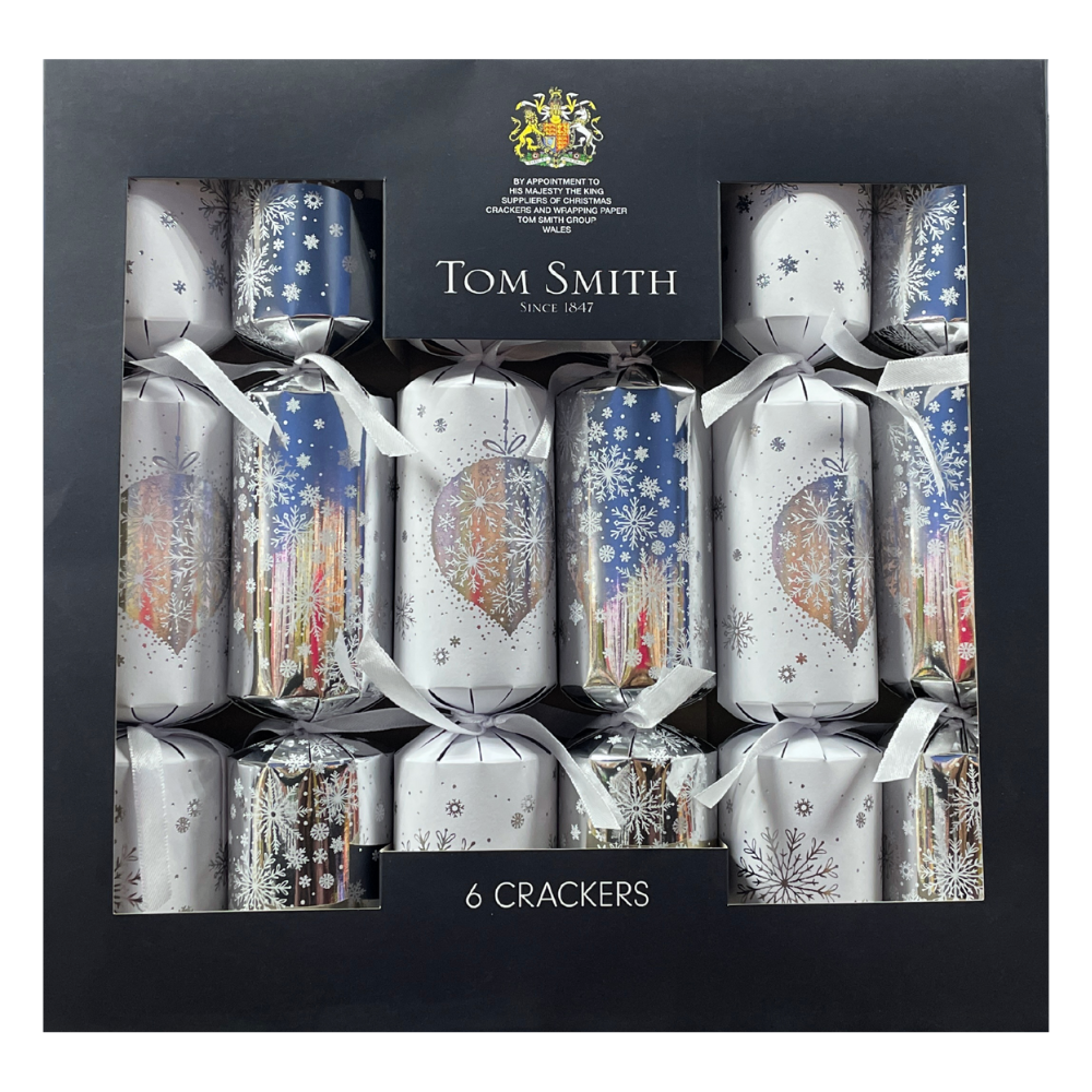 Christmas crackers each contain a paper crown (folded tissue party hat), a British joke or riddle, the cracker-snap, and a small novelty gift item